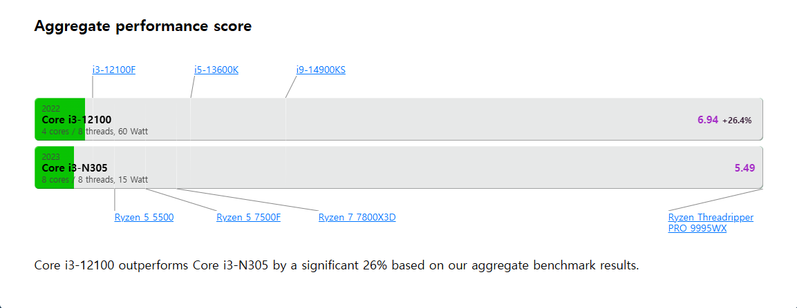 현재 사용 중인 i3-12100 과 비교해 보니 성능은 약간 떨어지지만 소모전류는 60Watt vs. 16Watt 로 매우 우세!